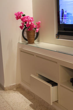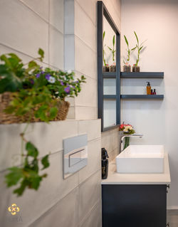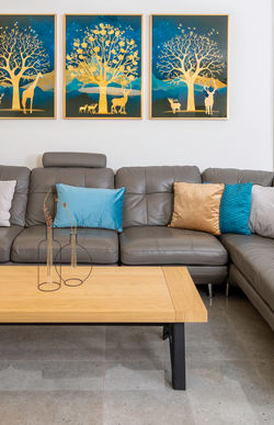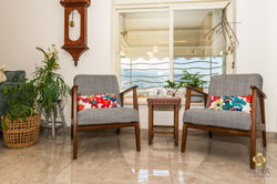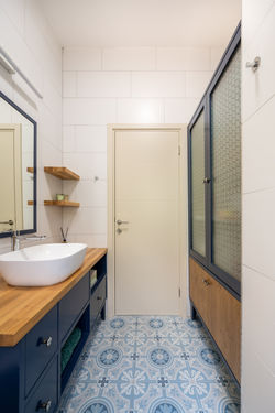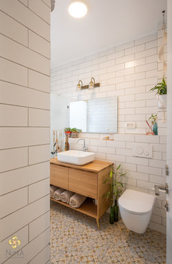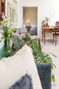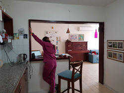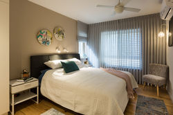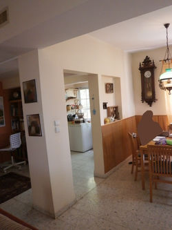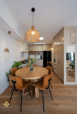דירת 5 חדרים מקבלן למשפחה ששניים מילדיה כבר יוצאים מהבית והשלישית לפני גיוס. הלקוחות פנו אלי לאחר שניתקו קשר עם מעצבת קודמת בבקשה לסיים איתם את התהליך, להשתמש בריהוט הקיים ובתמונות אהובות מהדירה הקודמת, למצוא מקום לפריטים קטנים שאוספים ולפתור טעויות שהתגלו. תוכננה מחיצה דקורטיבית בין פינת האוכל למסדרון ושירותי האורחים, שחוצצת ומשמשת לתצוגת הפריטים שאוהבים וגם יוצרת פינה קטנה עם מראה נחמדה בכניסה. הנמכת התקרה למיזוג "התעגלה" ליצירת תחושה נעימה, גמישה ומזמינה יותר כאשר נכנסים הביתה.