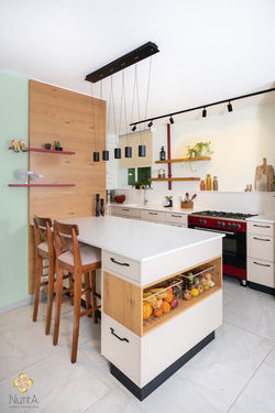 משפחה צעירה עם תקציב קטן במגדל העמק, ביקשו להחליף את המטבח ולהרגיש פחות צפוף בבית שקיבלו מההורים. המטבח הישן, העמוס והחשוך עבר לחלל הציבורי במקום חדר שינה שחסם את הכניסה לבית. במקום המטבח, תוכנן חדר שינה. הצבעוניות של המטבח נבחרה בהשראת צבעי פירות וירקות שונים ומשטח השיש, בהשראת ארון הנעליים שהיה בכניסה והלקוחה מאוד אהבה את צבעו. התוצאה, מרחב מואר, צעיר ומנוצל היטב.
